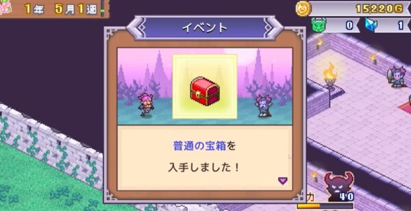 宝箱を置くと冒険者が集まりやすくなりますが、開けられるとお金を失います。必ず周囲に強力なモンスターや罠を配置して守りましょう。