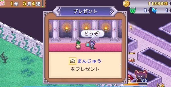 プレゼントでモチベーションアップ⇒ 「まんじゅう」や「鉄パイプ」などのアイテムをモンスターに贈ることで、彼らのステータスややる気を強化できます。