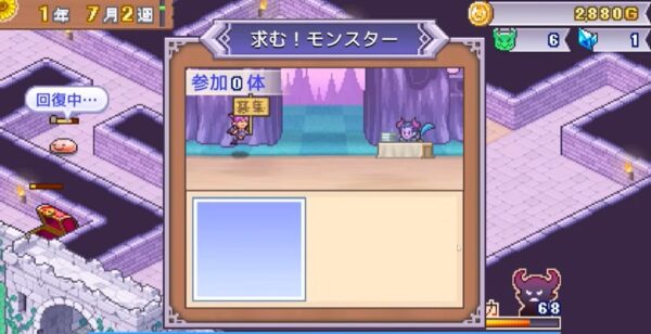 ランクアップ試験⇒ 「魔力」を高め、指定された条件(配置数やアイテムなど)をクリアして試験に合格すると、魔王城のランクが上がり、より強力なモンスターを雇えるようになります。