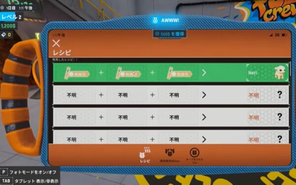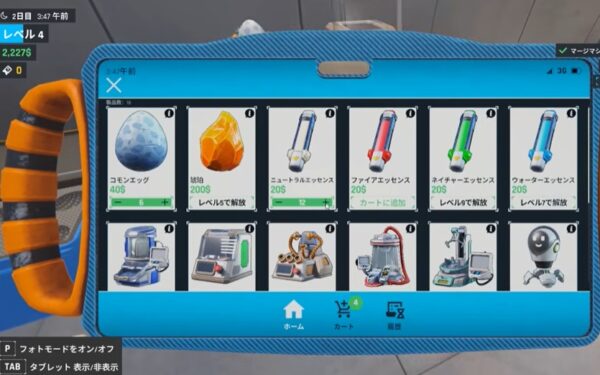 • 買い物⇒ タブレットで卵やエッセンス、設備を購入する。